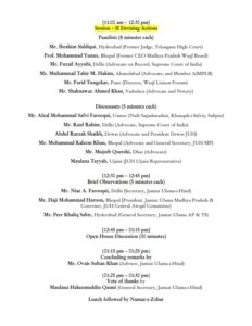 The second panel, “Devising Actions,” featured distinguished panelists including (Former Judge, Telangana High Court), Prof. Mohammad Yunus (Former CEO Madhya Pradesh Waqf Board), Mr. Fuzail Ayyubi (Advocate on Record, Supreme Court of India), Mr. Muhammad Tahir M. Hakim (Advocate; and Member AIMPLB), Mr. Farid Tungekar (Director, Waqf Liaison Forum), and Mr. Shahnawaz Ahmed Khan (Advocate and Notary). The panel was complemented by discussants such as Mr. Afzal Mohammad Safvi Farooqui, (Naib Sajjadanashin, Khanqah-i-Safvia, Safipur), Mr. Zafar Javeed (Vice Chairman, Sultan-ul-Uloom Education Society), Mr. Abdul Razzak Shaikh (Advocate and President Dewas JUH), Mr. Mohammad Kaleem Khan (Advocate and General Secretary, JUH MP), and Maulana Tayyab (JUH Ujjain Representative), who contributed valuable perspectives to the discourse.